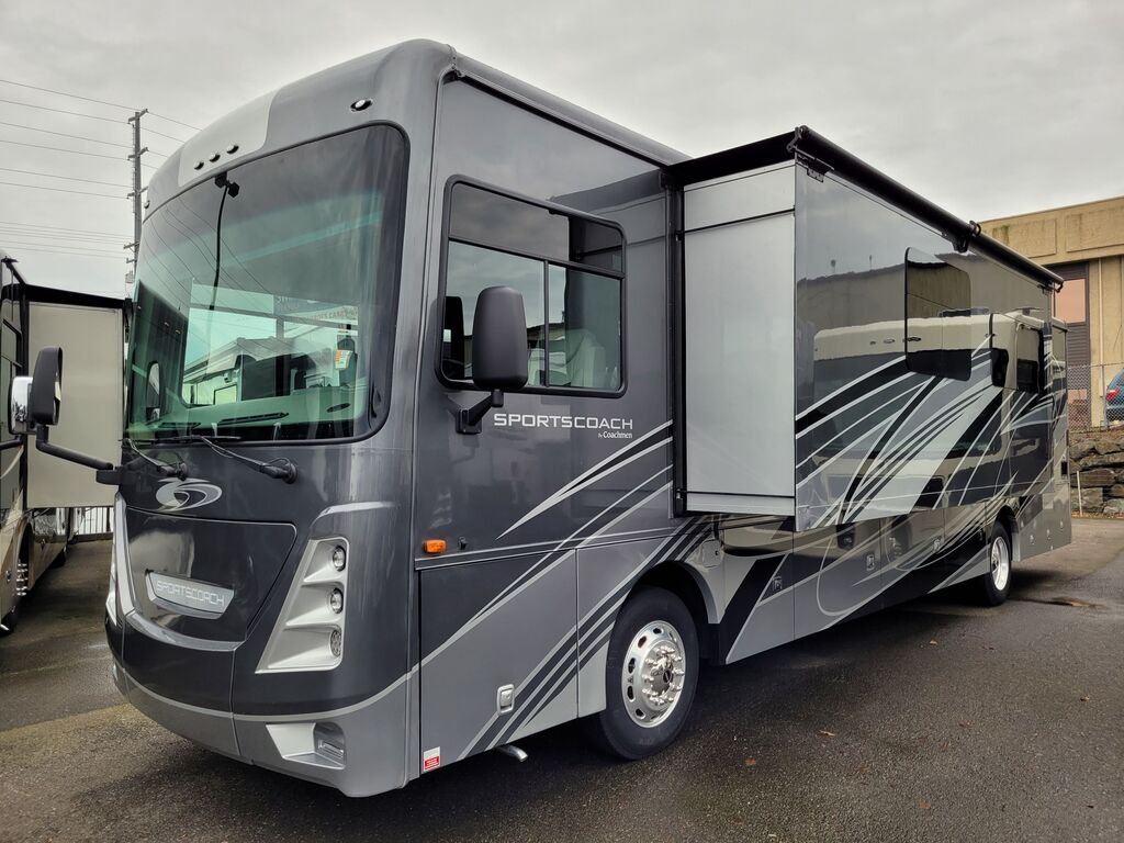 Introducing the Coachmen Sportscoach 365RB, a remarkable motorhome that truly redefines the RVing experience. This brand new RV boasts a generous length of 41.08 feet, making it an excellent choice for families or groups seeking adventure on the open road. With a luxurious sleeping capacity for up to 8 individuals, it guarantees comfort and convenience for everyone aboard. The interior living area is designed to offer spaciousness and adaptability, featuring two slide-outs that expand the space significantly. Enjoy the pleasure of outdoor living with the included awning, providing a perfect setting for relaxation under the sun. Equipped with powerful front and rear leveling jacks, this diesel-fueled RV ensures stability and ease of setup at your campsite. The Sportscoach is built with a robust GVWR of 22,046 pounds and can tow up to 10,000.17 pounds, enabling you to bring along additional gear for your travels. As a family-owned, award-winning local RV dealer with multiple locations in Sumner, Everett, Kent, and Mt. Vernon Washington, Poulsbo RV is here to help you find the perfect RV. This model encapsulates everything you need for unforgettable journeys. Stock#: E5623, VIN: 4UZACJFC0PCUN9665.