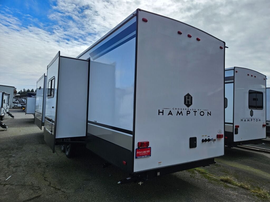 Introducing the 2025 CrossRoads Hampton HP372FDB, a remarkable RV designed for families seeking adventure and comfort on the road. This newly available travel trailer boasts an impressive length of 41.34 feet, providing ample living space for up to four people. Perfectly suited for RVing enthusiasts, it combines functionality with modern conveniences, ensuring that every journey feels like a home away from home. With a dry weight of 11,472 pounds and a Gross Vehicle Weight Rating (GVWR) of 15,000 pounds, this unit excels in stability and performance. The smart design features three slide-outs, which significantly expand the living area and enhance comfort during your travels. You will appreciate the front and rear power leveling jacks that make setup a breeze, allowing you to focus on enjoying your adventure. This model does not have a bunkhouse, making it ideal for a small family or a couple looking for extra space for guests. Additional amenities enhance this RV experience, making it delightful for weekends away or longer trips. Equipped with a single awning, the exterior offers a welcoming area to relax outdoors. As a family-owned, award-winning local RV dealer with multiple locations in Sumner, Everett, Kent, and Mt. Vernon Washington, Poulsbo RV is here to help you find the perfect RV. Stock#: E5876, VIN: 4YDTHPT27S9330287.